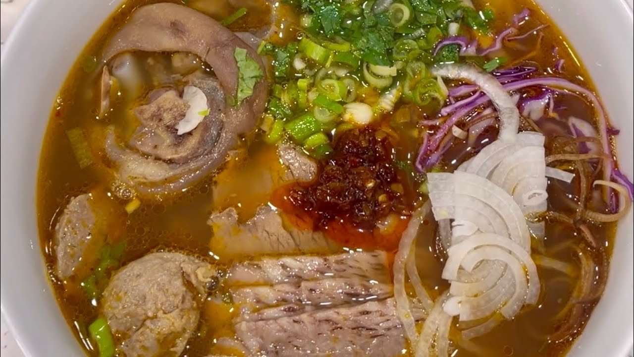 Bún bò Huế or bún bò is a Vietnamese rice noodle (bún) dish with sliced beef (bò), chả lụa, and sometimes pork knuckles. The dish originates from Huế, a city in central Vietnam associated with the cooking style of the former royal court. The dish has a mix of spicy, salty, and savory flavors. The predominant flavor is that of lemongrass. Compared to phở or bún riêu, the noodles are thicker and cylindrical.